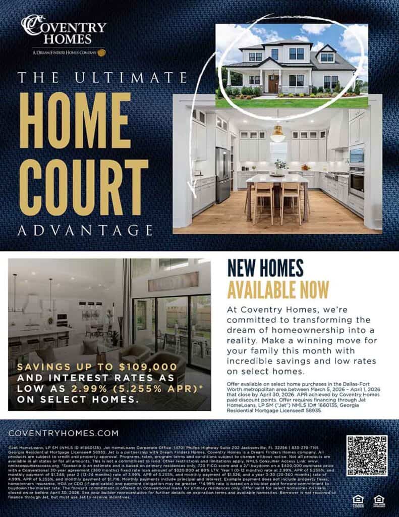 Make a winning move this month with Coventry Homes’ Ultimate Home Court Advantage Sales Event, running now through March 22. This special promotion allows buyers to choose the incentive that best fits their needs, with opportunities including savings up to $109,000 and interest rates as low as 2.99% (5.255% APR) on select homes.